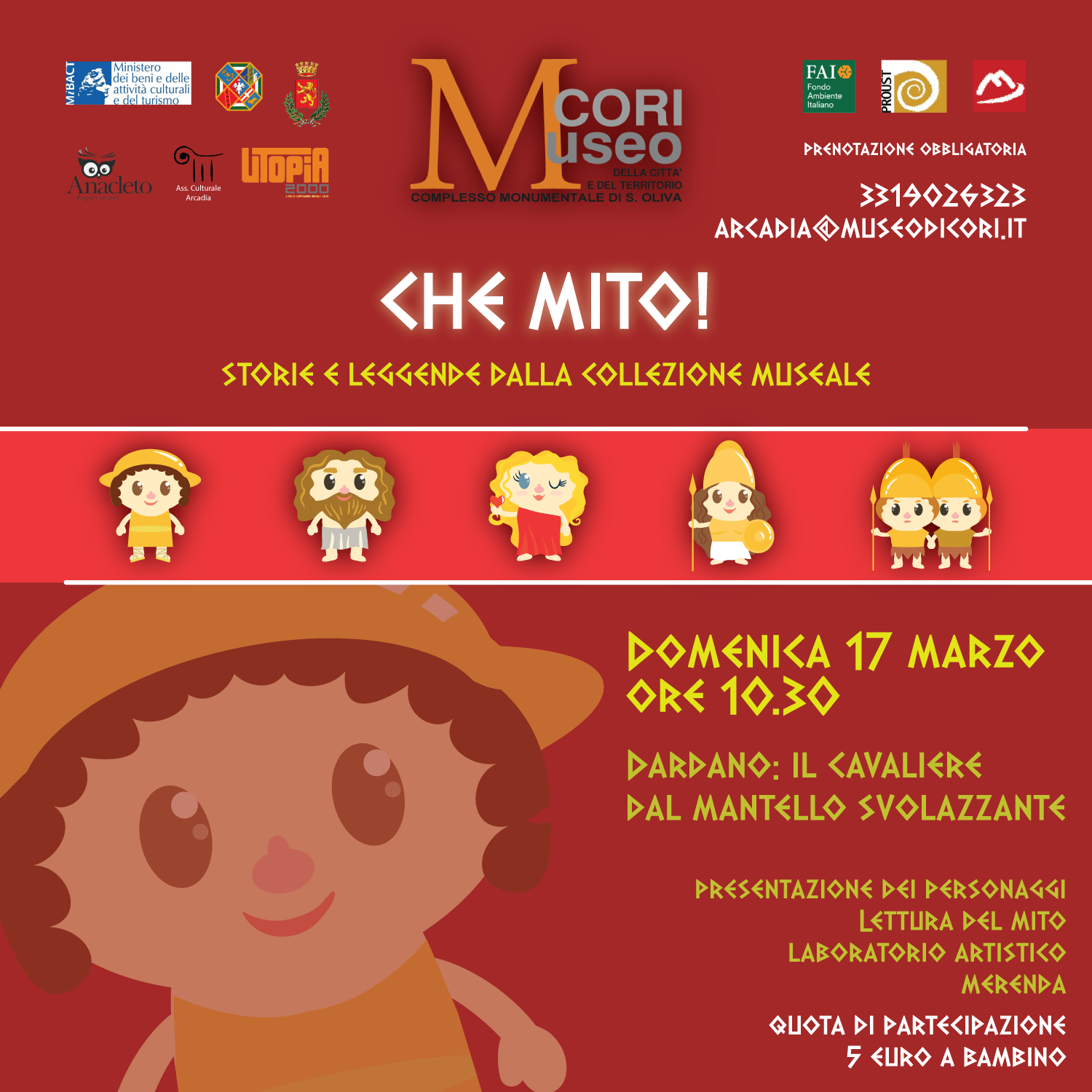 Locandina-DardanoCORI (LT) – Domenica 17 marzo, dalle ore 10:30, presso il Museo della Città e del Territorio di Cori (LT), si volgerà l’ultimo appuntamento del ciclo di letture animate e laboratori per le famiglie “Che Mito! Storie e leggende dalla collezione museale e dal territorio”. Il progetto è ideato e realizzato dall’associazione culturale Arcadia nell’ambito dei Servizi Educativi del Museo, con la collaborazione della “Libreria Anacleto” di Cisterna di Latina ed “Utopia 2000” Società Cooperativa Sociale Onlus, patrocinato dal Comune di Cori.