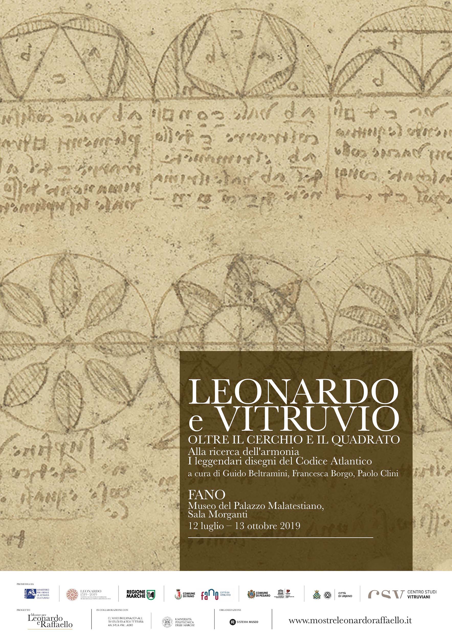 Il Comune di Fano ha scelto di partecipare alle celebrazioni di Leonardo riscoprendo il suo legame con Vitruvio, nella città del grande architetto romano, e presenta la mostra “Leonardo e Vitruvio: oltre il cerchio e il quadrato. Alla ricerca dell’armonia. I leggendari disegni del Codice Atlantico”, a cura di Guido Beltramini, Francesca Borgo e Paolo Clini.